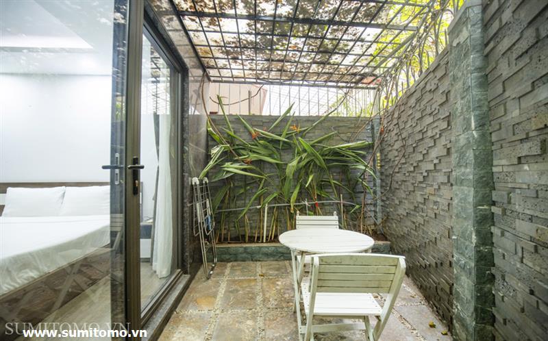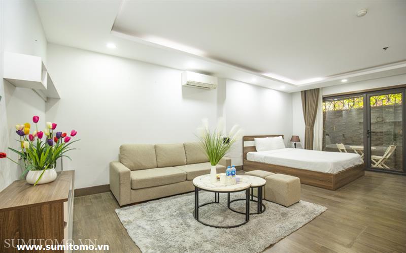 Fully furnished studio apartment for rent in a quiet and safe alley at 51, ngõ 12 Đào Tấn, Ba Đình. The unit includes 1 bedroom, 1 bathroom with hot water, a kitchen area, AC, bed, fridge, wardrobe, table and chairs – ready to move in.