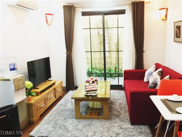The building for rent 1 bedroom serviced apartment with new furniture, with balcony, modern price 700.000vnd/night. The price includes full furniture, cleaning and laundry 3 times a week, 16-channel Japanese TV, washlet, air purifier, washing machine for guests, guests only bring suitcases to stay.