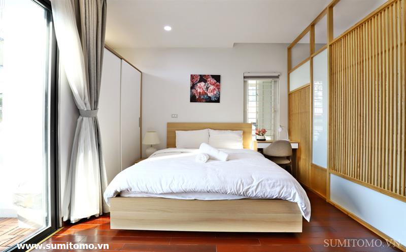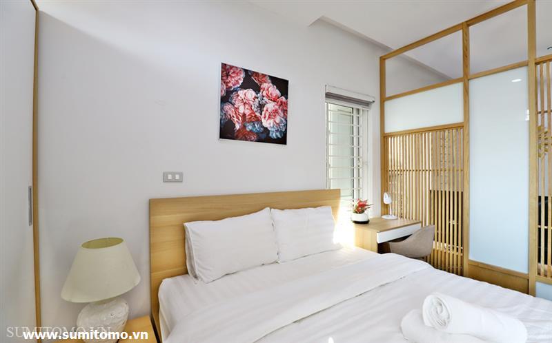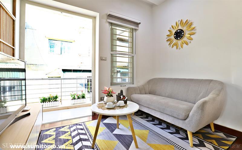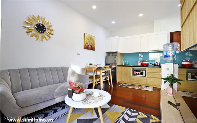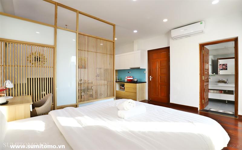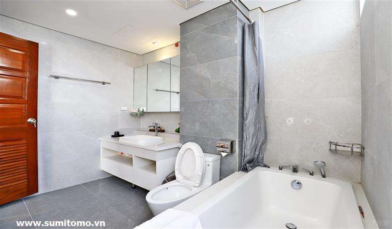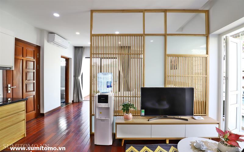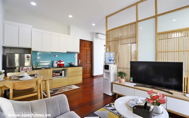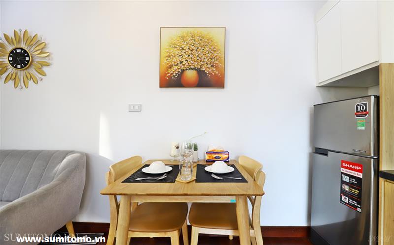 スミトモビル(Sumitomo Building)にて、Linh Lang通りの1ベッドルームサービスアパートを賃貸中。モダンで明るく温かみのあるデザインで、新しい家具・家電をフル完備しており、スーツケース一つでご入居いただけます。自動洗浄トイレ、専用洗濯乾燥機、バスタブ、55インチスマートTV(日本語チャンネル16局)など設備も充実しています。