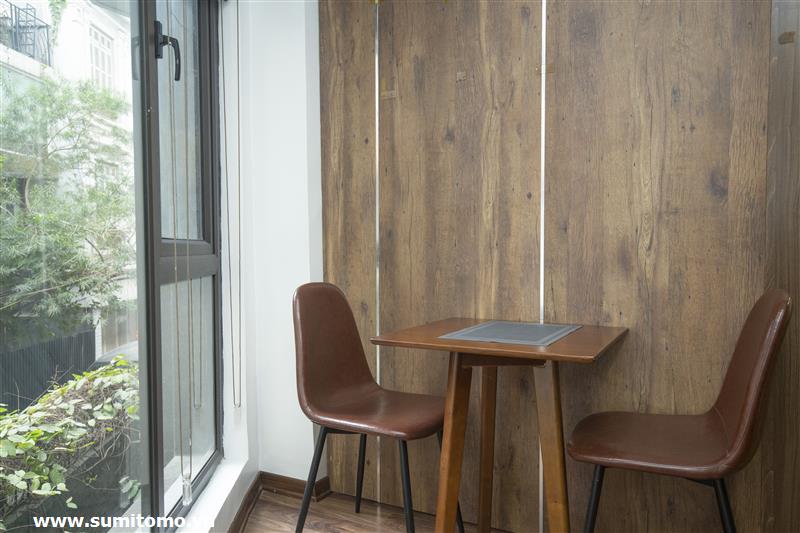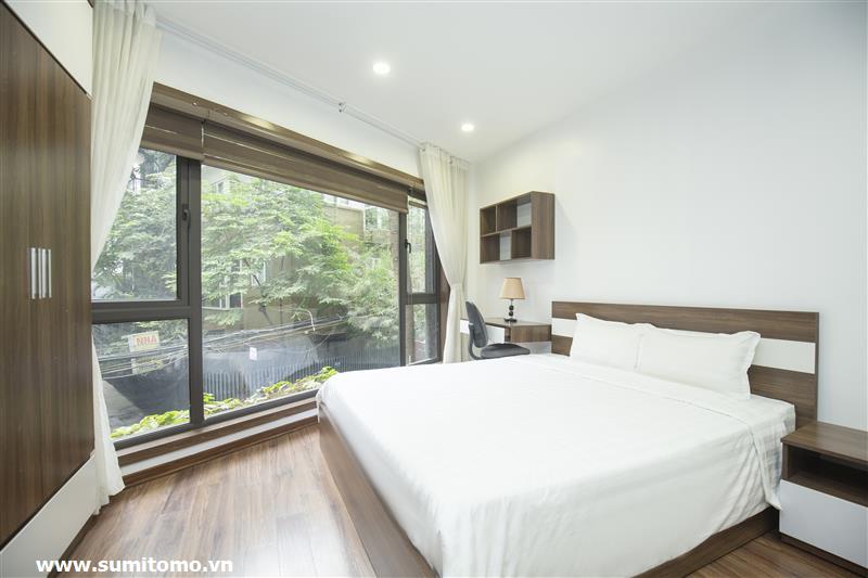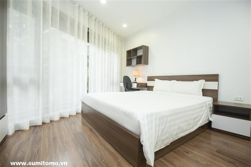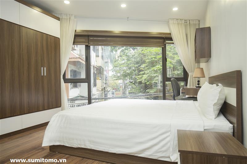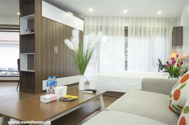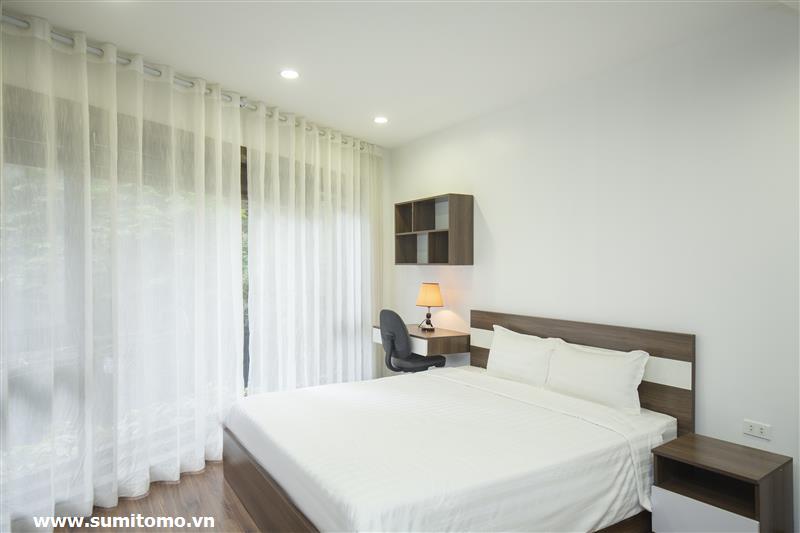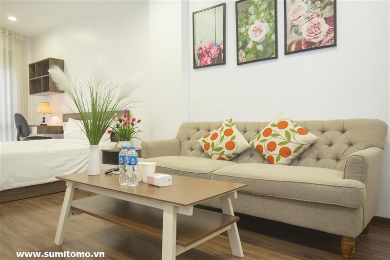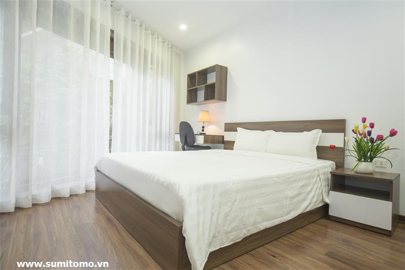 Toà nhà Sumitomo cho thuê căn hộ dịch vụ diện tích 50, 1 phòng ngủ tại phố Đào Tấn Căn hộ được thiết kế theo phong cách hiện đại, các phòng đều thoáng, sáng, nằm giữa hồ Thủ Lệ, hồ Ngọc Khánh. Các trang thiết bị được setup đầy đủ từ khăn tắm,đủ nồi chảo bát đĩa, có máy giặt sấy riêng trong phòng khách chỉ xách vali đến ở.