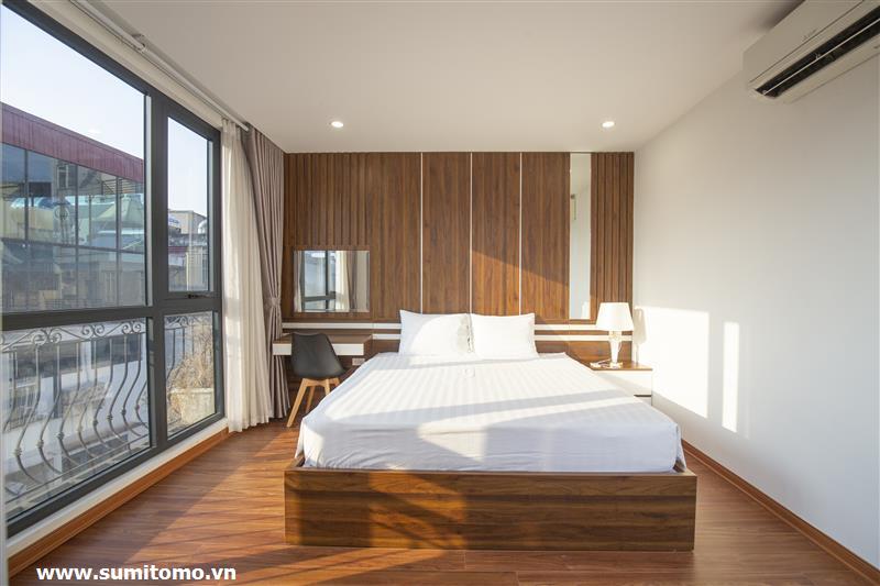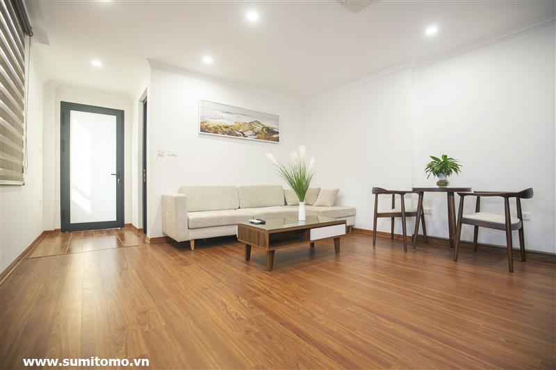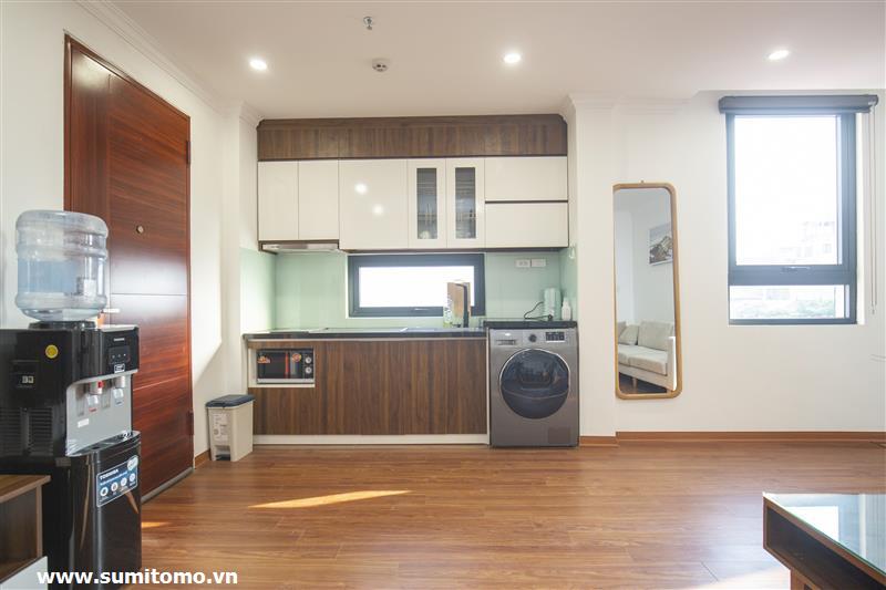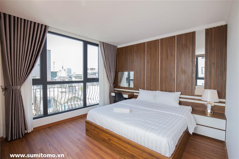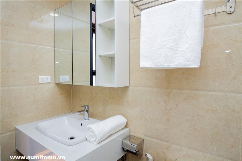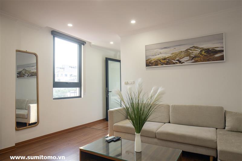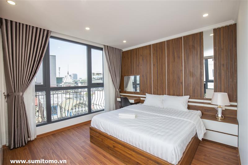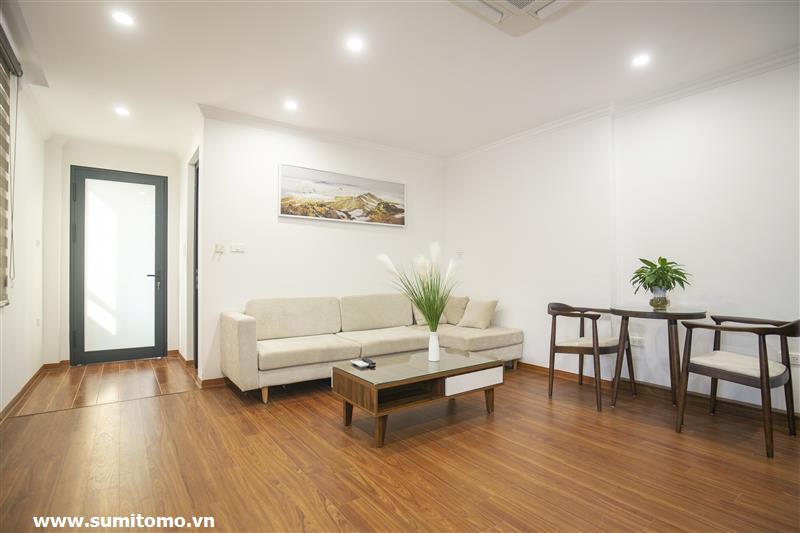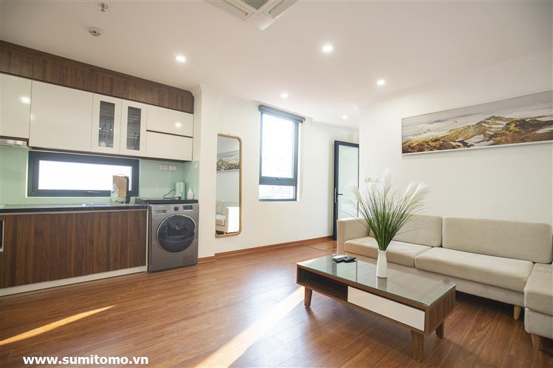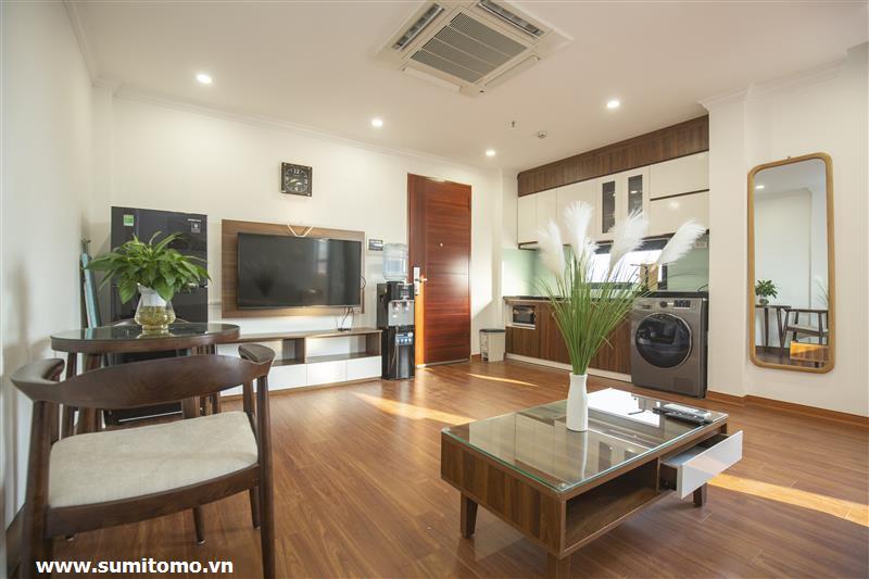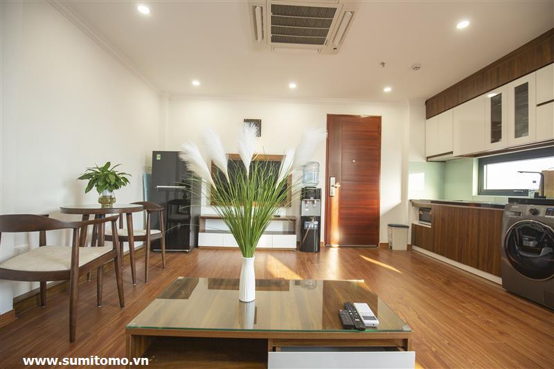 Toà nhà Sumitomo cho thuê căn hộ dịch vụ diện tích 50, 1 phòng ngủ tại phố Đào Tấn giá thuê từ 700 USD/Tháng. Căn hộ được thiết kế theo phong cách hiện đại, các phòng đều thoáng, sáng, nằm giữa hồ Thủ Lệ, hồ Ngọc Khánh. Các trang thiết bị được setup đầy đủ từ khăn tắm,đủ nồi chảo bát đĩa, có máy giặt sấy riêng trong phòng khách chỉ xách vali đến ở.
