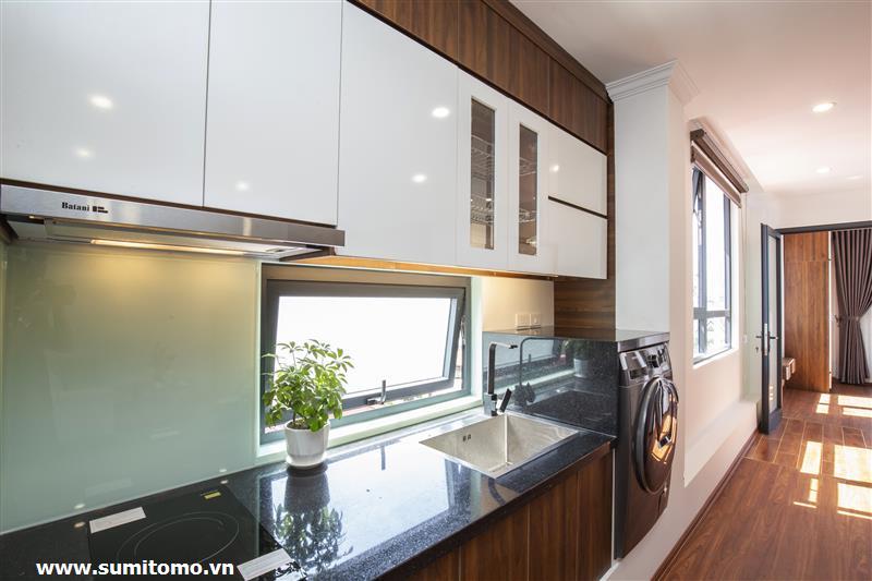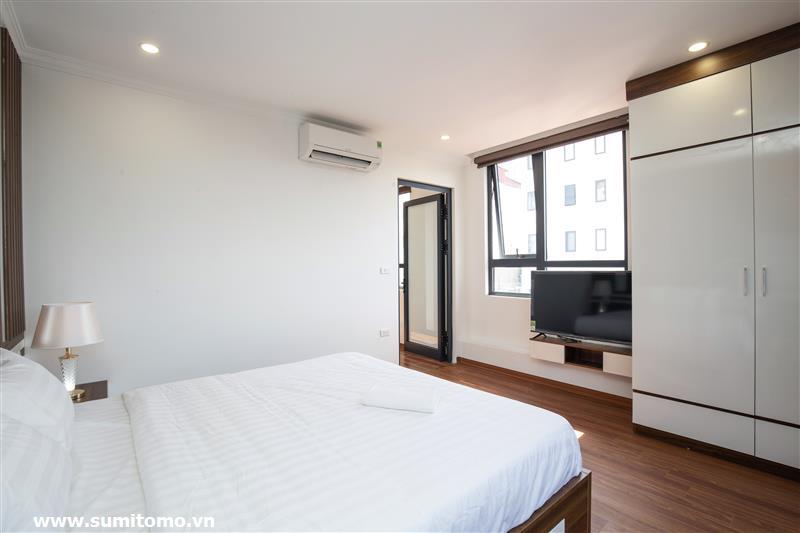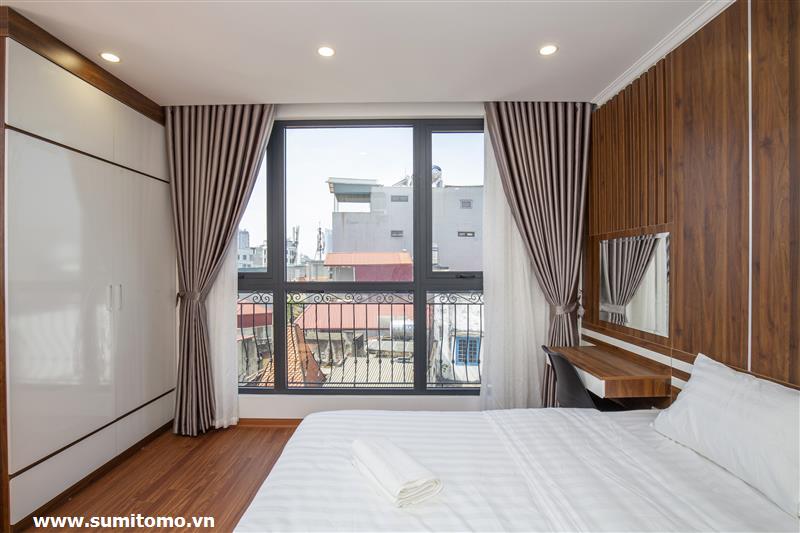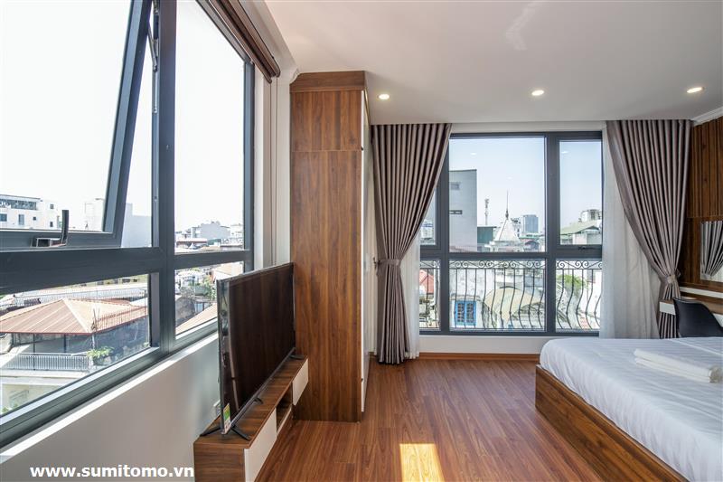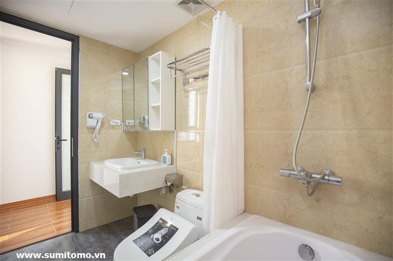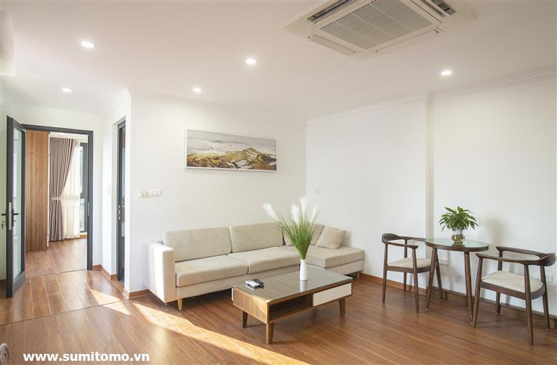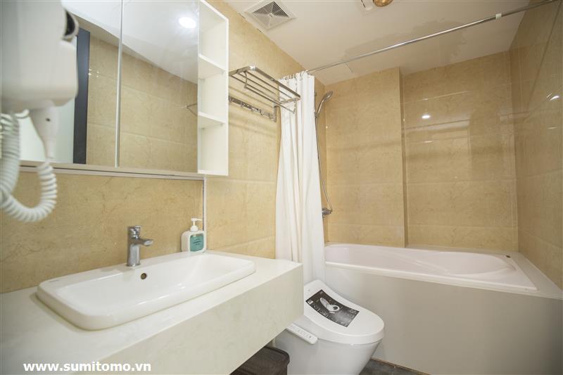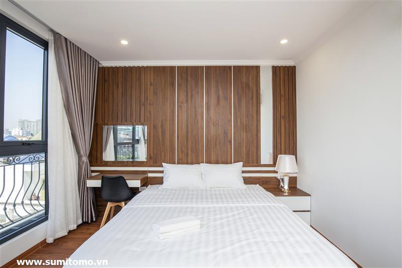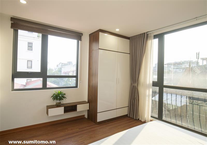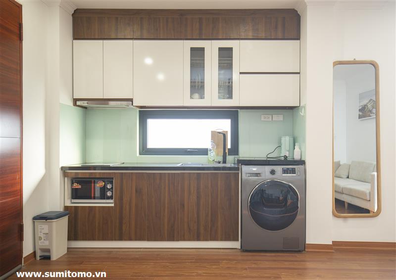 Toà nhà Sumitomo cho thuê căn hộ dịch vụ diện tích 50, 1 phòng ngủ tại phố Đào Tấn giá thuê từ 700 USD/Tháng. Căn hộ được thiết kế theo phong cách hiện đại, các phòng đều thoáng, sáng, nằm giữa hồ Thủ Lệ, hồ Ngọc Khánh. Các trang thiết bị được setup đầy đủ từ khăn tắm,đủ nồi chảo bát đĩa, có máy giặt sấy riêng trong phòng khách chỉ xách vali đến ở.