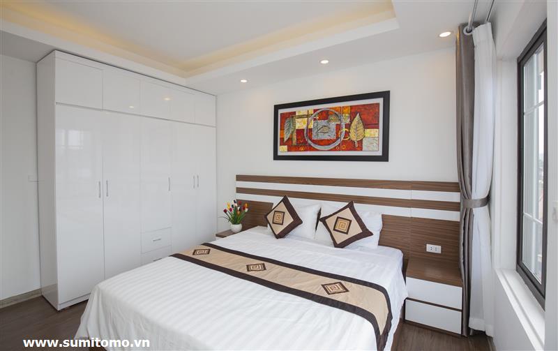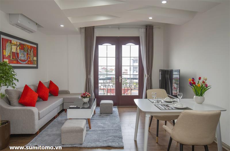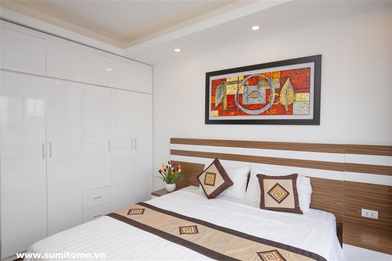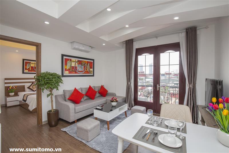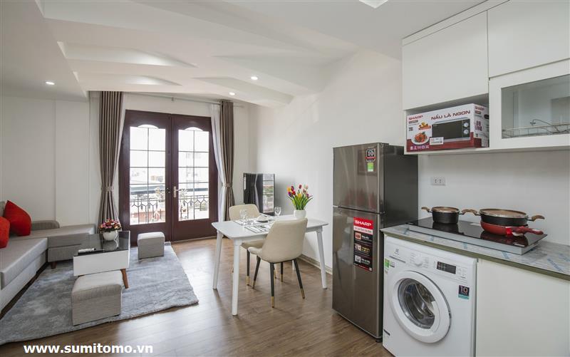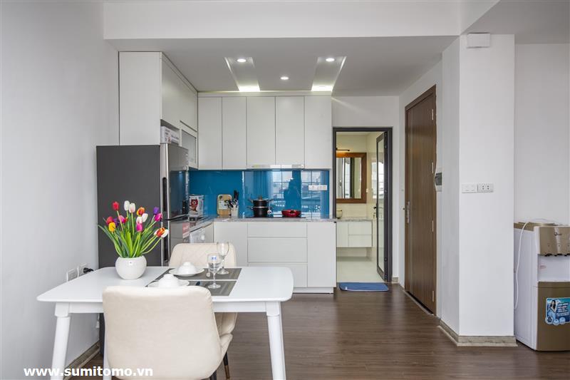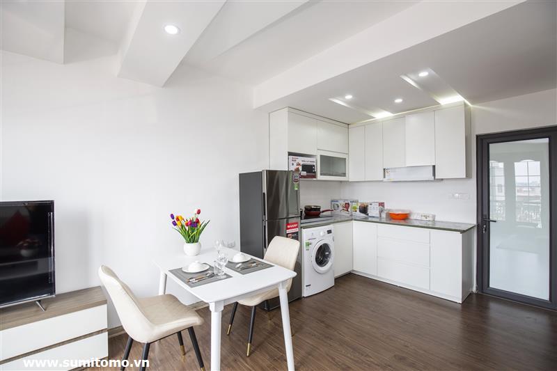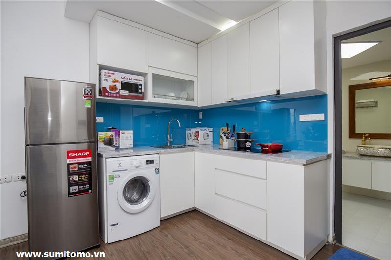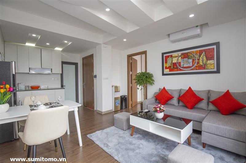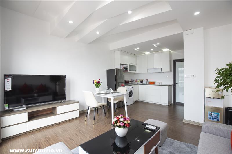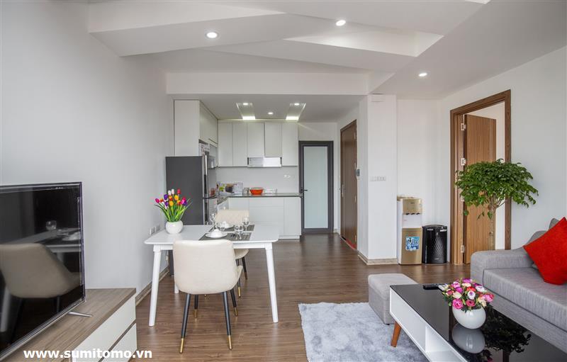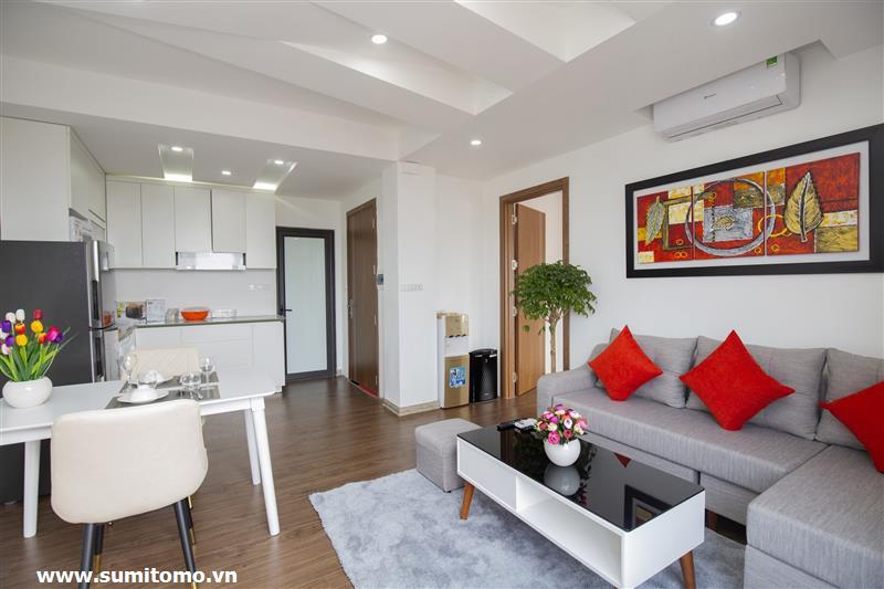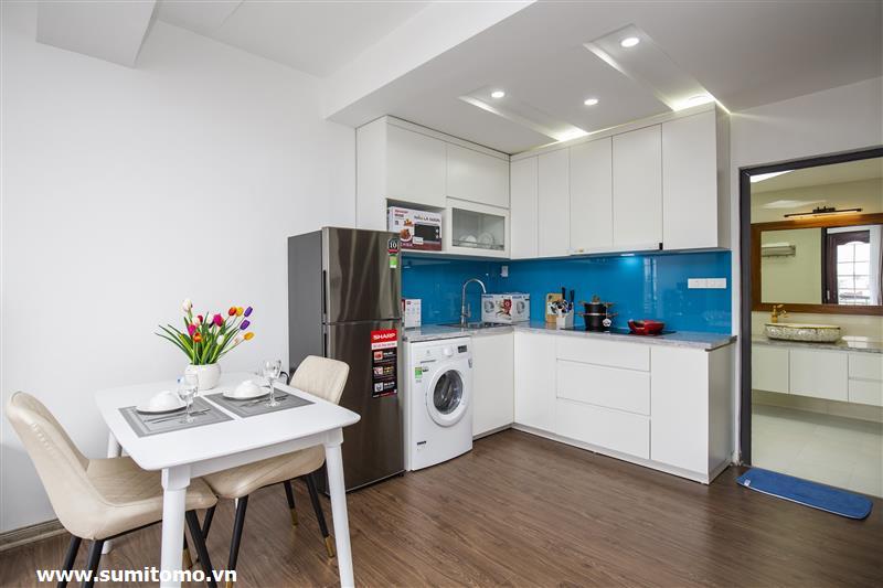 Toà nhà Sumitomo cho thuê căn hộ dịch vụ diện tích 50, 1 phòng ngủ tại phố Đào Tấn Căn hộ được thiết kế theo phong cách hiện đại, các phòng đều thoáng, sáng, nằm giữa hồ Thủ Lệ, hồ Ngọc Khánh. Các trang thiết bị được setup đầy đủ từ khăn tắm,đủ nồi chảo bát đĩa, có máy giặt sấy riêng trong phòng khách chỉ xách vali đến ở.