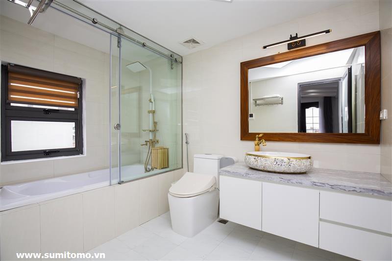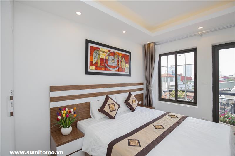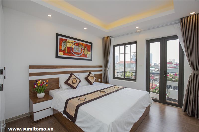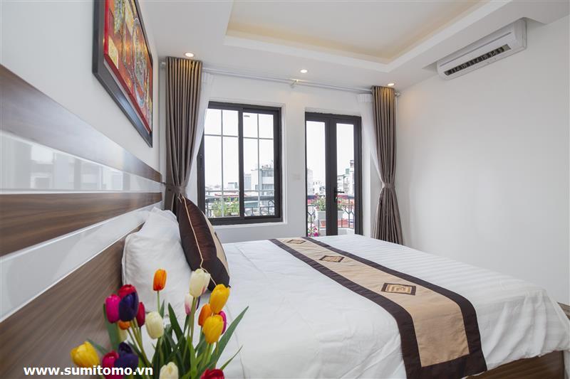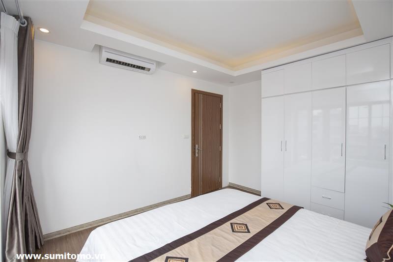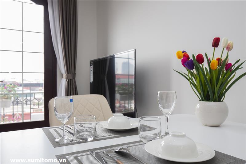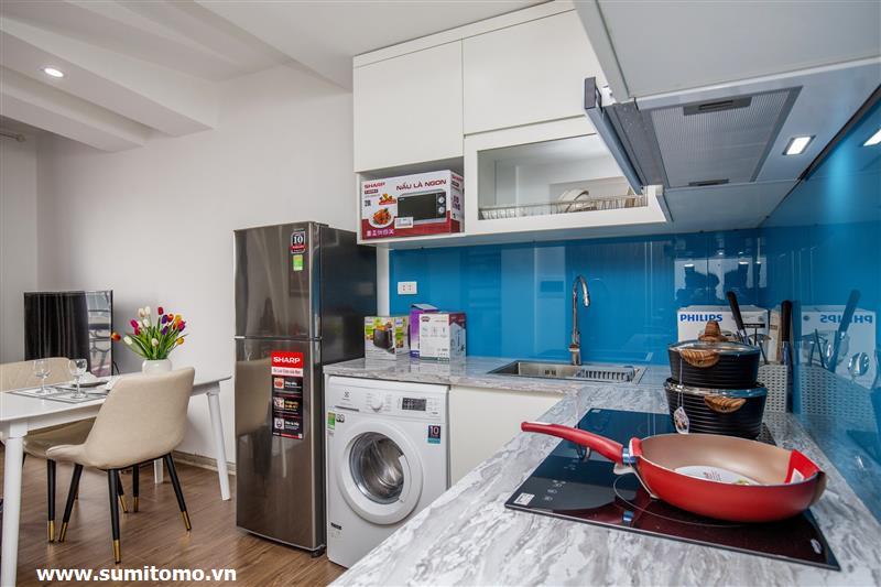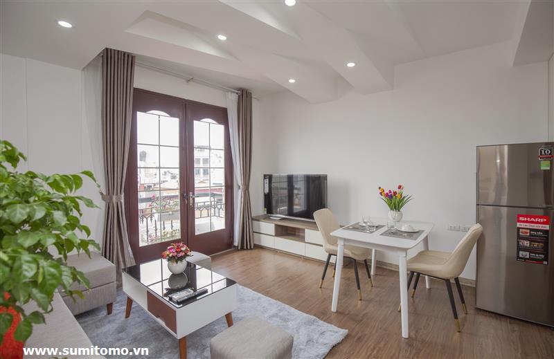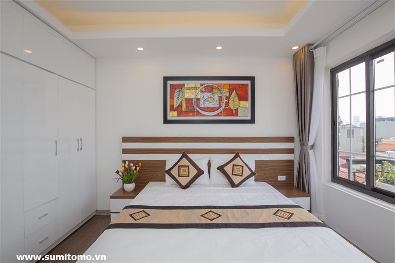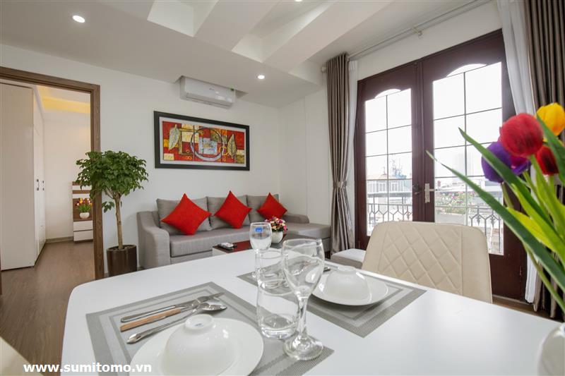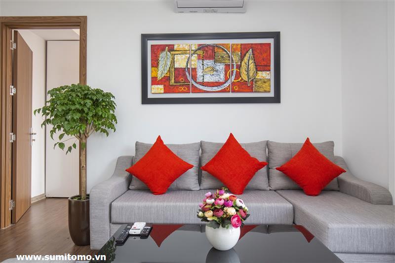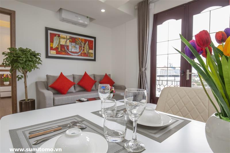 Toà nhà Sumitomo cho thuê căn hộ dịch vụ diện tích 50, 1 phòng ngủ tại phố Đào Tấn Căn hộ được thiết kế theo phong cách hiện đại, các phòng đều thoáng, sáng, nằm giữa hồ Thủ Lệ, hồ Ngọc Khánh. Các trang thiết bị được setup đầy đủ từ khăn tắm,đủ nồi chảo bát đĩa, có máy giặt sấy riêng trong phòng khách chỉ xách vali đến ở.